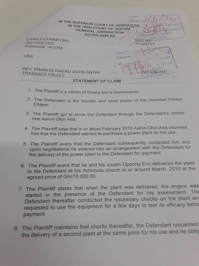 According to the plaintiff, who is a businessman, he supplied the renowned man of God with two sets of power plants, transmitter, and other equipment at a cost of ¢70,000.00 each in March 2019.