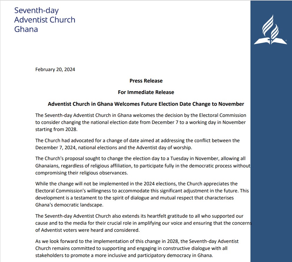 The Seventh-day Adventist Church expressed gratitude for the Electoral Commission's willingness to consider this significant adjustment in the future, and said the decision symbolised the spirit of dialogue and mutual respect that characterizes Ghana's democratic landscape.