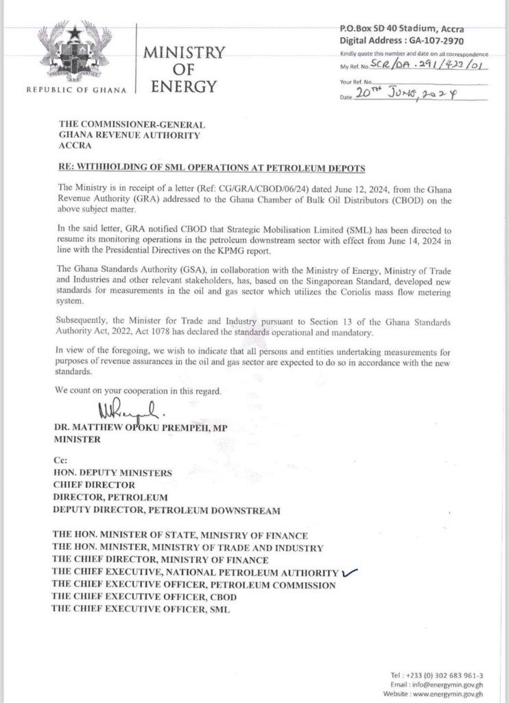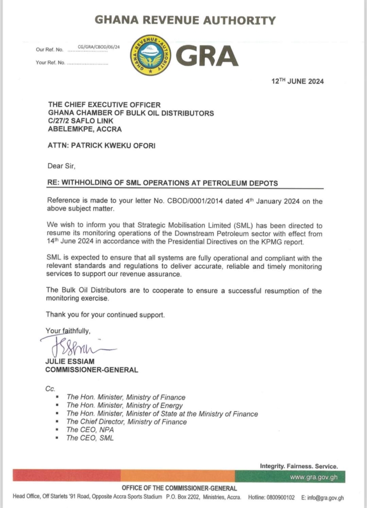 Strategic Mobilisation Limited (SML), has been directed by the Ghana Revenue Authority (GRA) to restart its monitoring activities in the downstream petroleum sector effective June 14, 2024.