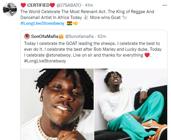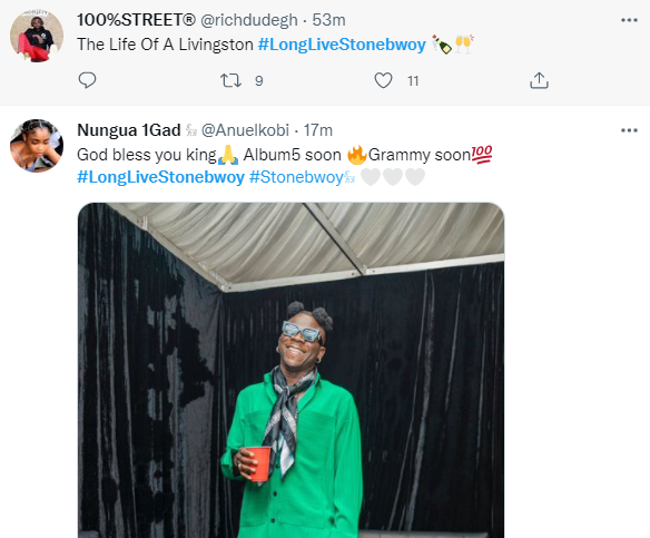 They have flooded social media space, Twitter, with well-wishes and accolades. The trend #LongLiveStonebwoy has been dedicated to the artiste.