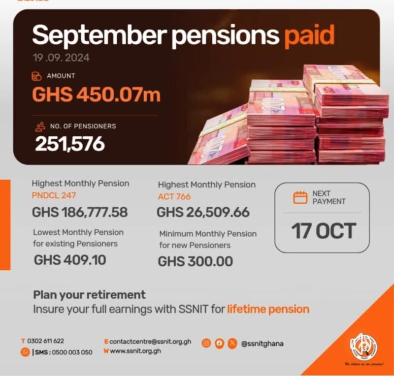 The Social Security and National Insurance Trust (SSNIT) has disbursed a total of GHȼ450.07 million to 251,576 pensioners for the month of September, 2024.