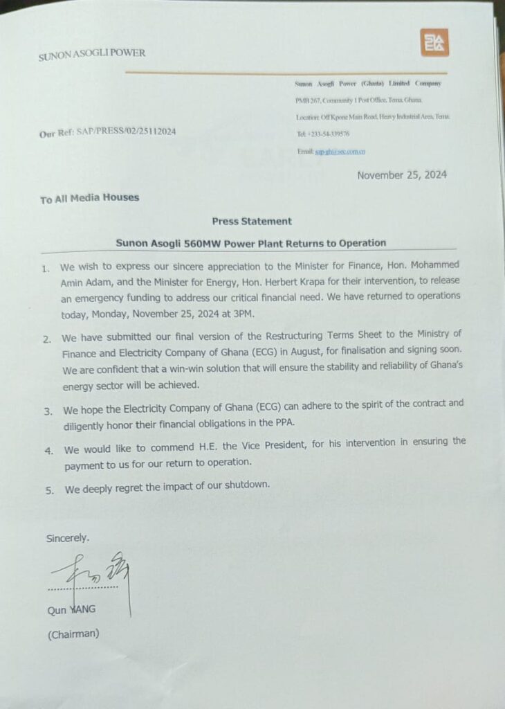 In a statement released on Monday, Sunon Asogli disclosed that it had submitted the final version of its Restructuring Terms Sheet to the Ministry of Finance and ECG in August, with plans for finalisation and signing shortly.