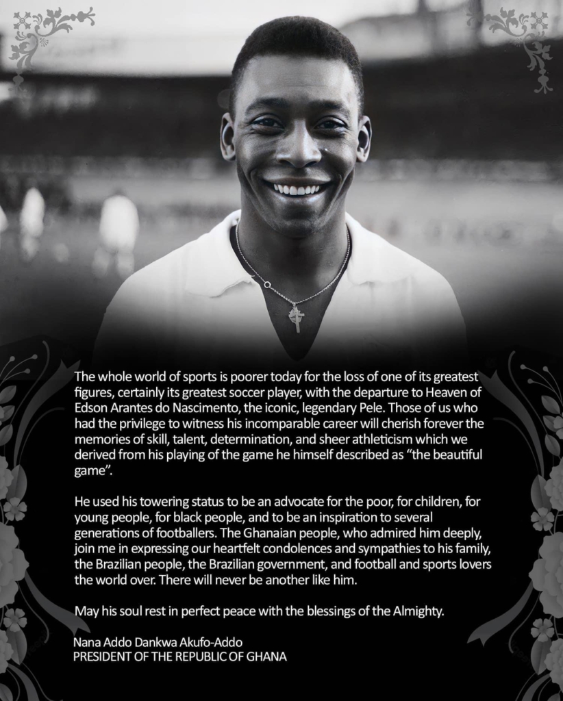 "The Ghanaian people, who admired him deeply, join me in expressing our heartfelt condolences and sympathies to his family, the Brazilian people, the Brazilian government, and football and sports lovers the world over. There will never be another like him", Akufo-Addo added.