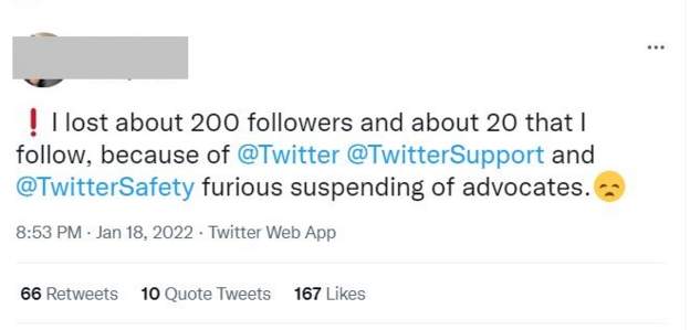 A tweet complaining of their friends having been suspended from the platform: