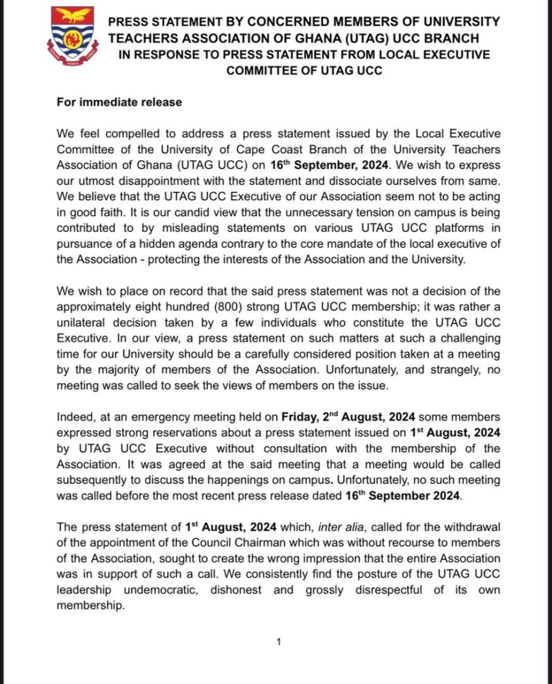 A group of concerned members of the University of Cape Coast (UCC) branch of the University Teachers Association of Ghana (UTAG) has expressed their disappointment with a recent press statement issued by the UTAG UCC Executive.