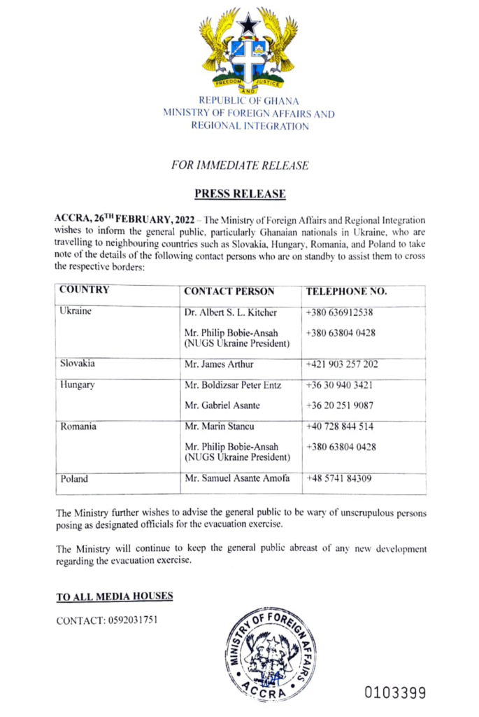 On February 26, the Foreign Affairs Ministry released a list of contact persons who have been tasked to help Ghanaian Nationals fleeing into neighboring countries.