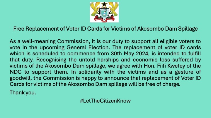 “In solidarity with the victims and as a gesture of goodwill, the Commission is happy to announce that replacement of voter ID cards for victims of the Akosombo Dam spillage will be free of charge.”