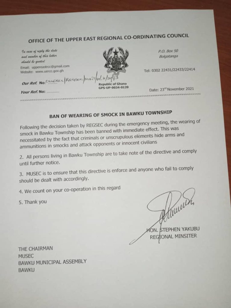 The Upper East Regional Co-ordinating Council has banned the wearing of smocks in Bawku township with immediate effect.