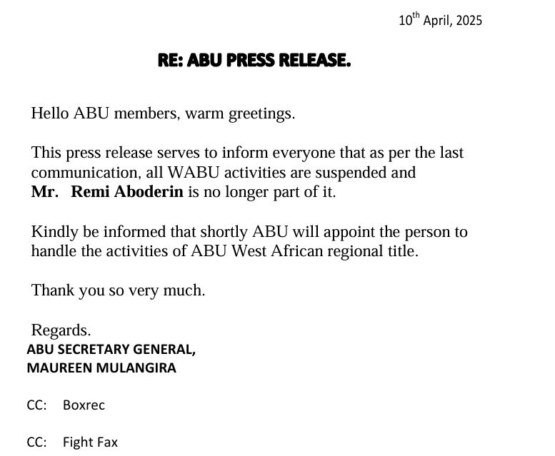 He is accused of misconduct by WABU members, a claim Aboderin has denied, insisting "they want to destabilise the boxing body".