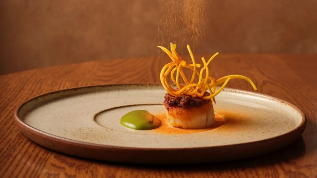 The thinly sliced meat is seasoned with suya, a traditional Hausa spice, grilled over firewood and served with a creamy bone marrow emulsion on a ceramic plate inspired by Nigeria's late renowned potter Ladi Kwali.