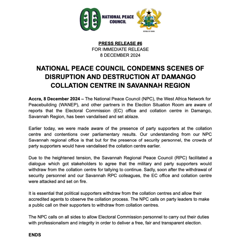 The National Peace Council and the West Africa Network for Peace-building (WANEP), have condemned the destruction of the Electoral Commission (EC) office and collation centre in Damongo in the Savannah Region.