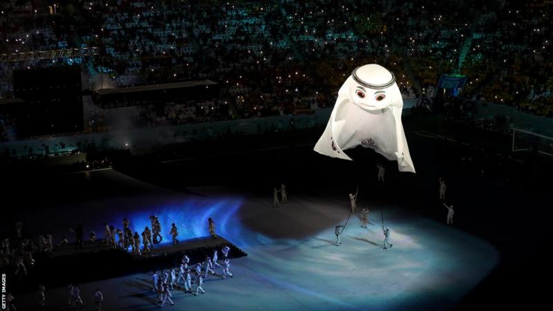 One of the dance routines featured giant walking kits of the 32 teams competing in the tournament and the mascots of previous World Cups alongside La'eeb, the 2022 mascot.