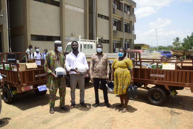 The items presented included 3 tricycles, 3 sets of protective clothing, 3 dual purposed motorized slashers, Insecticides, fungicides, and face masks.