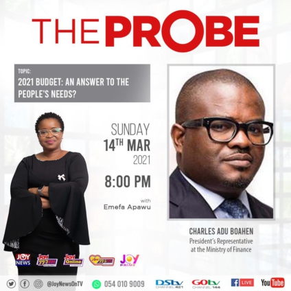 Join Emefa Apawu probe the President's representative and former Deputy Finance Minister Charles Adu Boahen this Sunday at 8 pm on the JoyNews channel, Joy 99.7fm, myjoyonline.com, DStv 421.