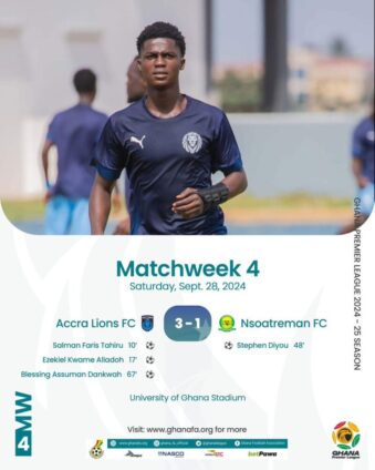 The victory lifts Accra Lions to 9th place on the league table with 4 points, while Nsoatreman sit 10th with 3 points.