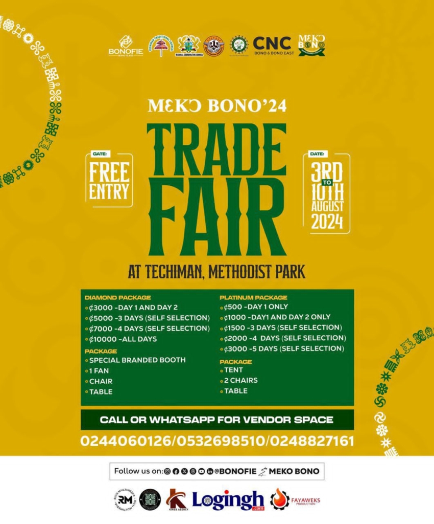 There will be AKOM/Trade Fair/DJ’s Scratch & Supreme Dance Challenge on Wednesday, 7th August 2024, a night of spiritual performances and modern entertainment, followed by Trade Fair/Face of Bonofie on Thursday, 8th August 2024, a cultural beauty pageant celebrating Bono culture and talent.