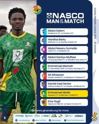 Aduana Stars' Emmanuel Marfo grabbed the headlines once again on Week 5 of the Ghana Premier League, as he and eight other outstanding players were named best performers in their respective matches.