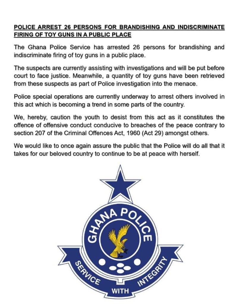 The Ghana Police Service has arrested 26 individuals for brandishing and firing toy guns indiscriminately in a public space.