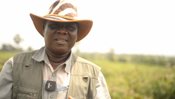 Prof Emmanuel Bobobee interacting with JoyNews’ Nana Yaw Gyimah on his farm, said with the right investment, Ghana can earn more money from cassava than the revenue raked in by cocoa.