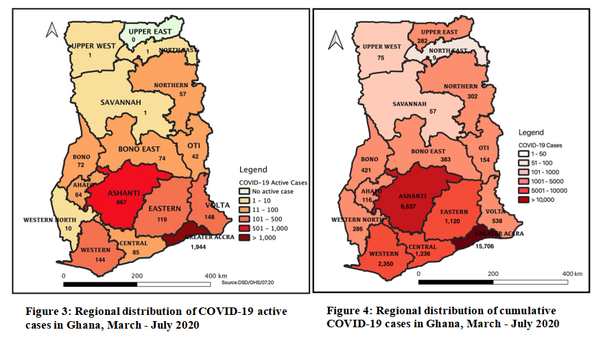 Greater Accra Region - 15,706; Ashanti Region - 6,637; Western Region - 2,350; Central Region - 1,236; Eastern Region - 1,120; Volta Region - 538; Bono Region - 421; Bono East Region - 383; Northern Region - 302; Western North Region - 286; Upper East Region - 282; Oti Region - 154; Ahafo Region - 116; Upper West Region - 75; Savannah Region - 57; North East Region - 9.