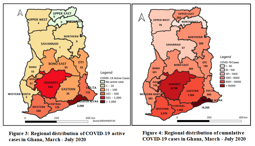 Greater Accra Region - 18,205; Ashanti Region - 8,748; Western Region - 2,576; Central Region - 1,366; Eastern Region - 1,304; Volta Region - 593; Bono East Region - 483; Bono Region - 431; Western North Region - 363; Northern Region - 309; Upper East Region - 282; Oti Region - 192; Ahafo Region - 145; Upper West Region - 79; Savannah Region - 57; North East Region - 9