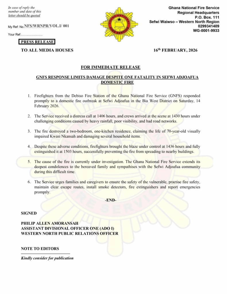“The fire destroyed a two-bedroom, one-kitchen residence, claiming the life of 70-year-old visually impaired Kwasi Nkansah and damaging several household items,” the statement said.