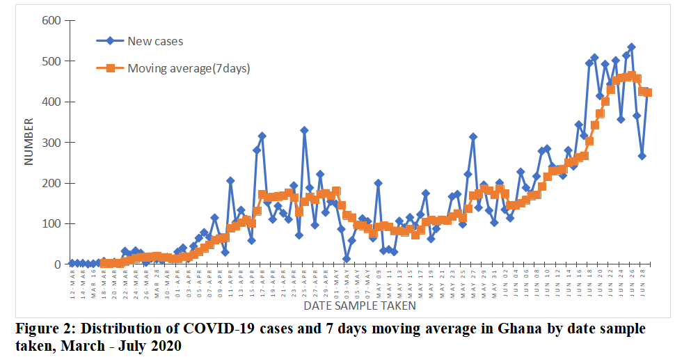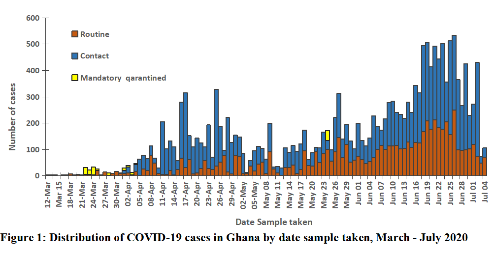 "A total of 854 new cases were reported on July 5,2020. These are samples that were taken from the period 16 June to 4 July 2020 as seen in Figure 8 but reported from the lab on July 5," said GHS.