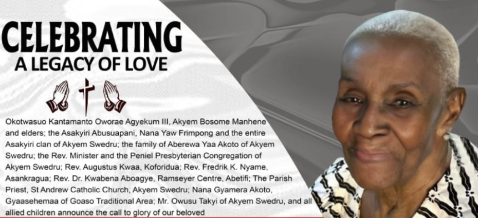 Okotwasuo Kantamanto Oworae Agyekum III, Akyem Bosome Manhene and elders, the Asakyiri Abusuapani, Nana Yaw Frimpong and the entire Asakyiri clan of Akyem Swedru; the family of Abrewa Yaa Akoto of Akyem Swedru, Nana Gyamera Akoto, Gyaasehemaa of Goaso Traditional Area, Mr Owusu Takyi of Akyem Swedru, and all allied children announce the call to glory of our beloved :