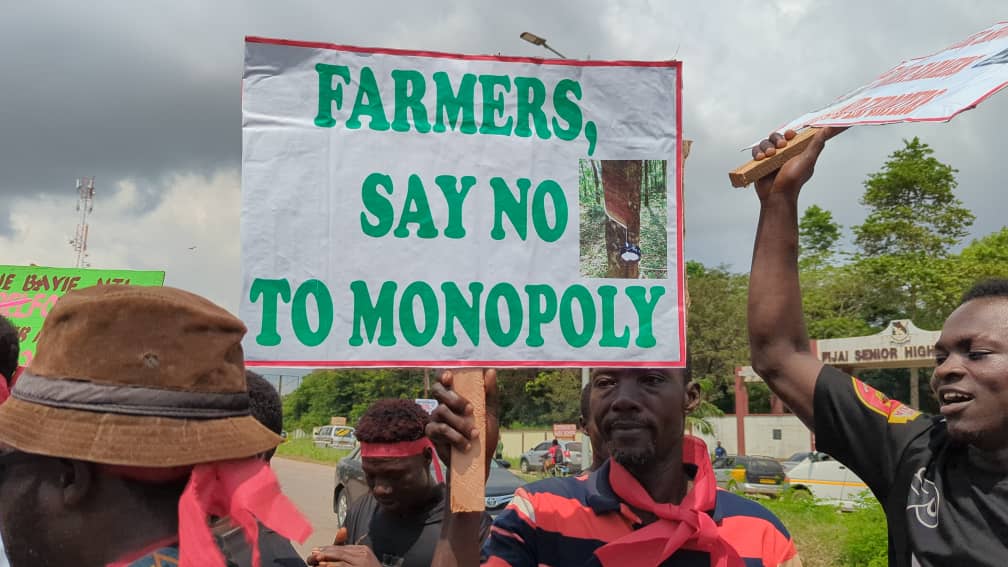 Most of the protesters were clad in red and black, carrying placards with inscriptions such as “Farmers Say No to Monopoly,” “Rubber Is for All Ghanaians,” “No Instant Payment, No Ban,” “Processors Are Greedy,” and “Everyone Must Eat".