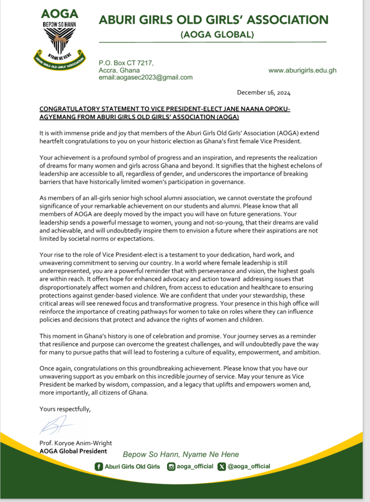 The Aburi Girls Old Girls' Association (AOGA) has extended heartfelt congratulations to Vice President-elect Jane Naana Opoku-Agyemang on her historic election as Ghana's first female Vice President.