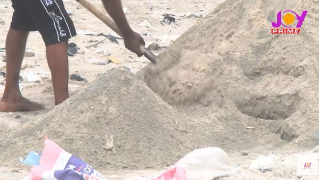 They scoop the beach sand into several sacks and sell the sacks of sand for construction works. Although beach sand mining is banned in Ghana, the activity is still rife.