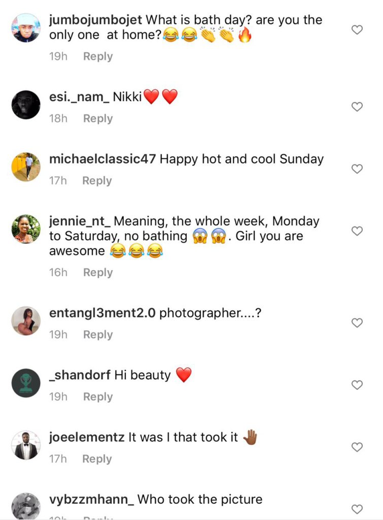 The post captioned ‘Sundays bath tub day’ has since garnered several reactions with some lauding what they say is her natural beauty.