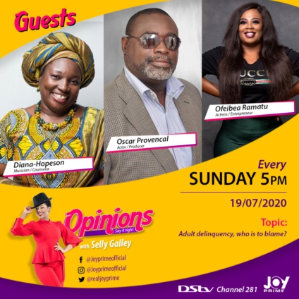 Prolific gospel musician and former MUSIGA President, Diana Hopeson and Seasoned actor Oscar Provencal, alongside actress and entrepreneur, Offeibea Ramatu have voiced their opinions on the subject: Adult Delinquency, who is to blame on a flagship show on Joy Prime, OPINIONS.