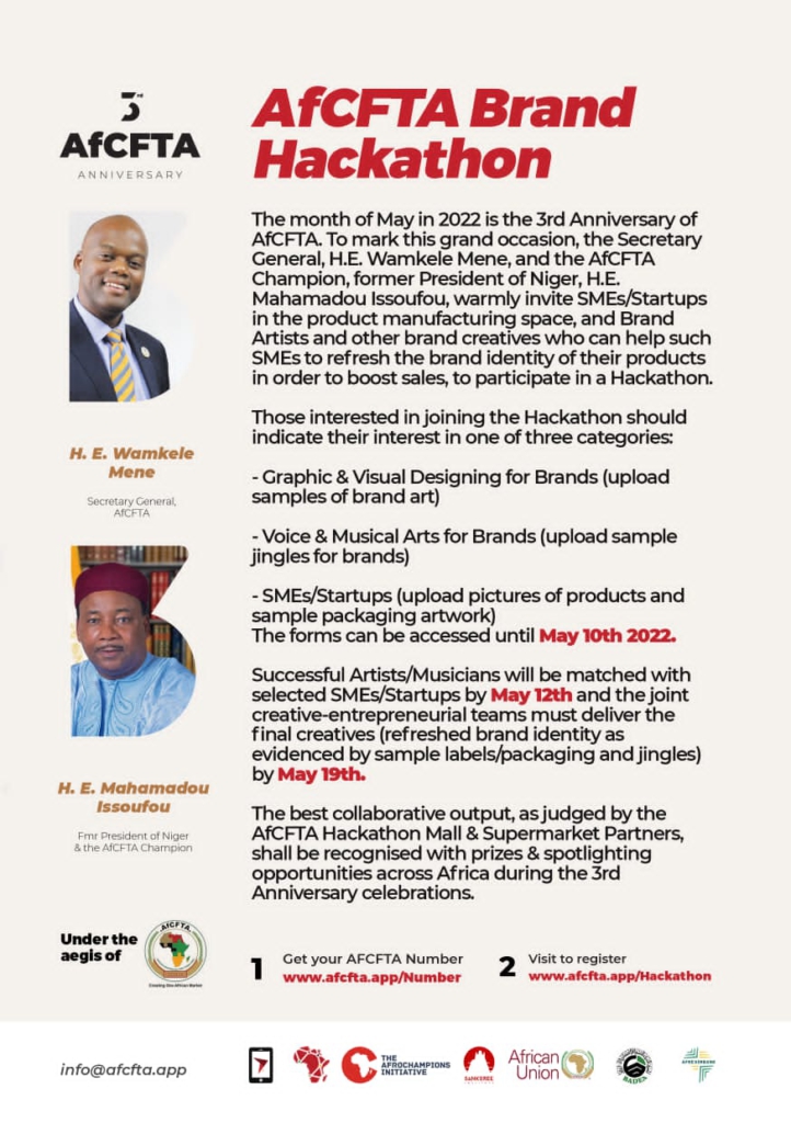 “To mark this grand occasion, the Secretary-General, H.E. Wamkele Mene, and the AfCFTA Champion, former President of Niger, H.E.Mahamadou Issoufou, warmly invite SMEs/Startups in the product manufacturing space, and brand artists and other brand creatives who can help such SMEs to refresh the brand identity of their products in order to boost sales, to participate in a Hackathon,” AfCFTA said in a statement.
