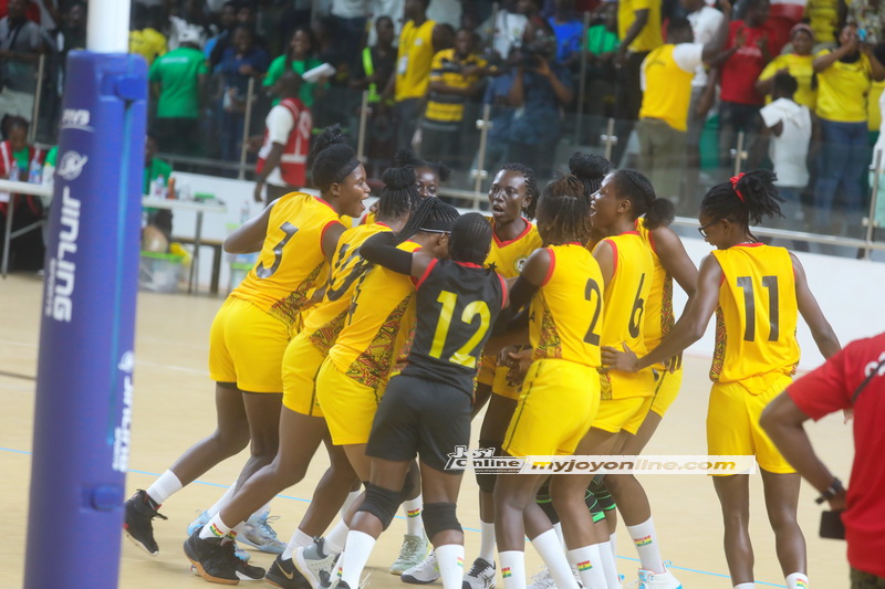 Players of Ghana Black Spikers jubilate after their victory over their Gambian counter part Photo-David Andoh