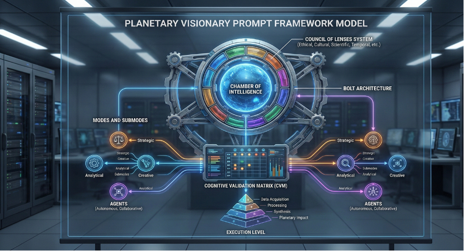 The purpose of this article is to unpack the Planetary Visionary Prompt Framework 2026 in practical terms and demonstrate why its structure offers a superior and safer governance model compared to conventional Western AI approaches. The analysis will examine the core components of the framework, including the Chambers of Intelligence, the Council of Lenses, the Bolt system, the Cognitive Validation Matrix, the Modes and Sub-modes architecture, the Agent orchestration layer, and the Execution Level ladder. Each element will be examined in contrast with how dominant models such as GPT, Gemini, and other Western proprietary systems conceptualise or omit comparable structures.