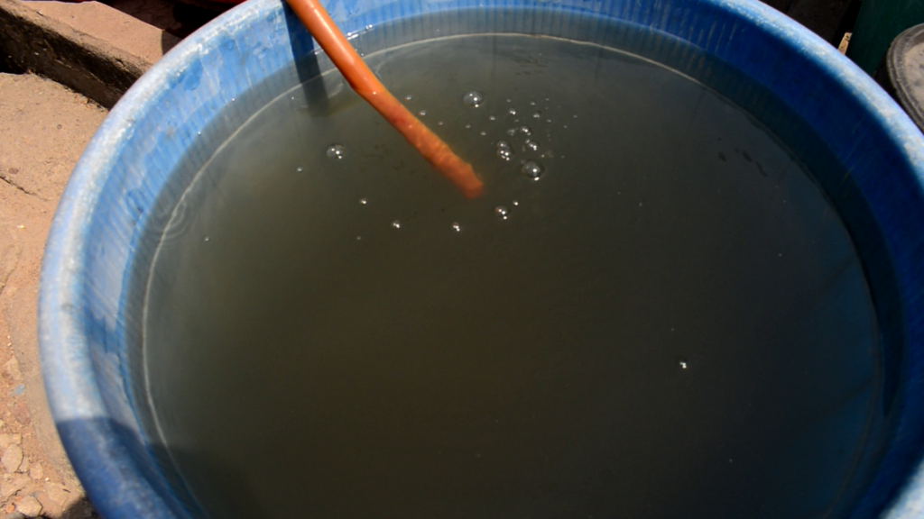 A water vendor in the community explained that the colour of the water remained red because there wasn't sufficient chemical to treat it.