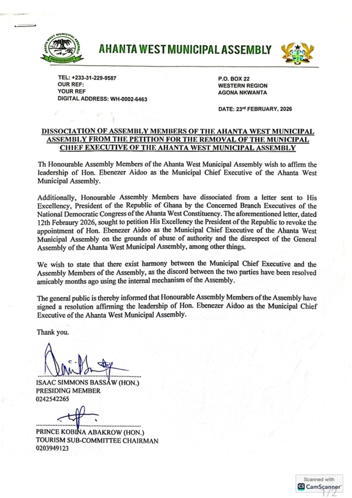 The Assembly Members of the Ahanta West Municipal Assembly have officially distanced themselves from a petition calling for the removal of Municipal Chief Executive (MCE) Ebenezer Aidoo.