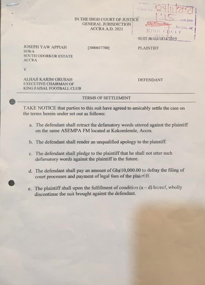 The Executive Chairman of King Faisal Football Club, Alhaji Karim Grusah, will retract and render an unqualified apology to Joseph Yaw Appiah for defamatory words uttered against the former GHALCA boss.