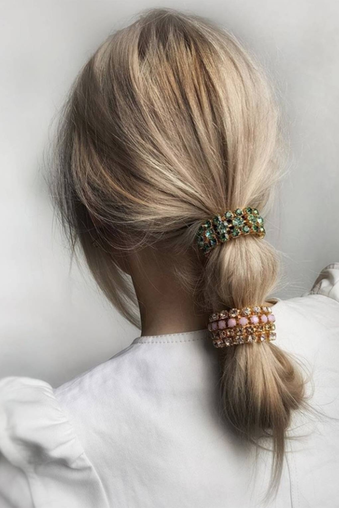 Switch up you usual ponytail but incorporating a tuck at the end and layering on some embellished hair bands.