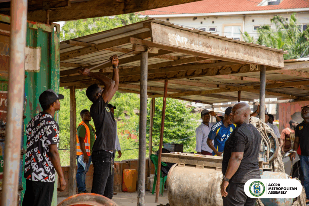 The operation further saw the removal of structures along the Awudome Cemetery corridor and the frontage of the Royal House Chapel. Individuals engaged in activities such as air-conditioning repairs, vulcanising, food vending and the sale of car spare parts were removed from the area and cautioned not to return.