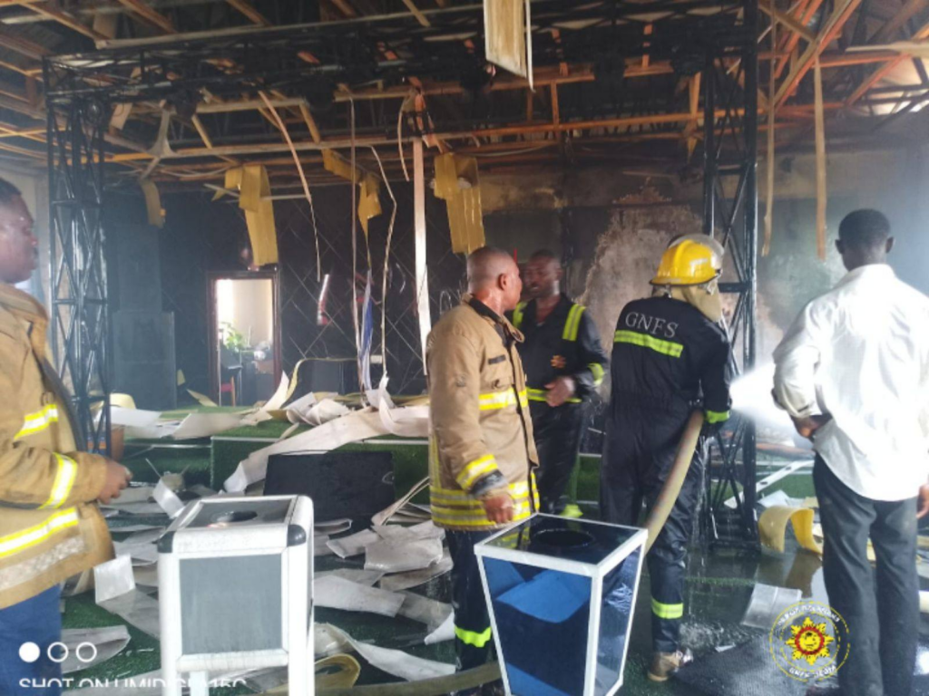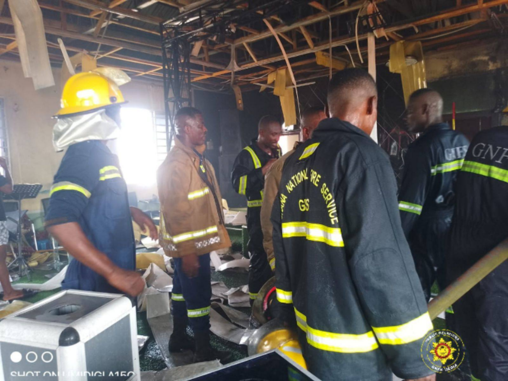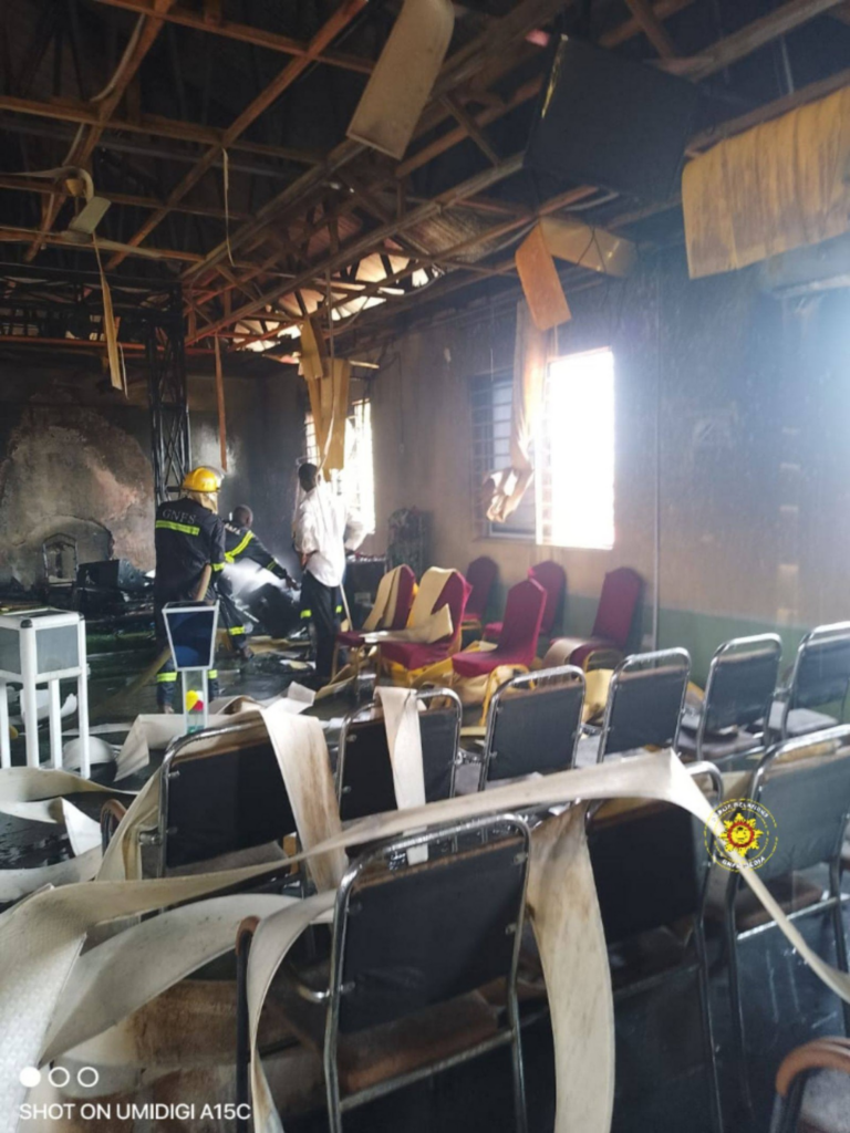 The fire broke out in the church auditorium on the top floor of the two-storey building and was already underway when firefighters arrived on the scene. Reinforcements from the Madina Fire Station joined the crew in tackling the blaze.