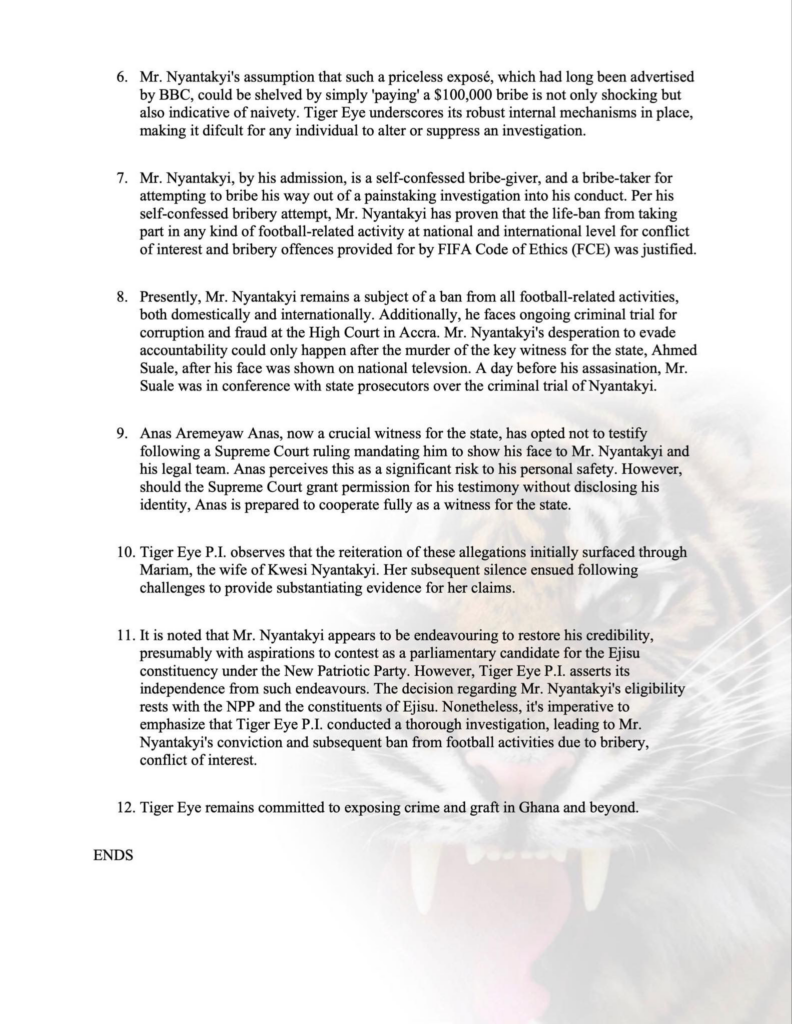 “Tiger Eye P.I. firmly denies any involvement or knowledge of such activities. Should Mr. Nyantakyi's claims hold substance, we challenge him to pursue legal action against Kwame Gyan, including lodging a petition with the General Legal Council, to substantiate his allegations.”