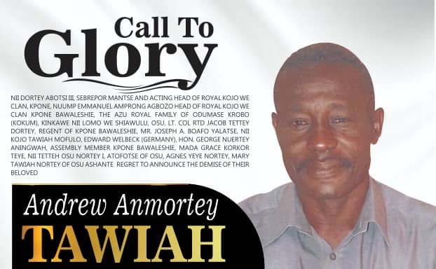 Nii Dortey Abotsi III, Srebepor Mantse and Acting Head of Royal Kojo We Clan, Kpone, Nuum Emmanuel Amprong Agbozo, Head of Royal Kojo We Clan, Kpone Bawaleshie, the Azo Royal Family of Odumase Krobo (Kokum), Ninkawen Ni Lomo W Shiawulu, Osu, Lt. Col. Dr Jacob Tettey Dortey, Regent of Kpone Bawaleshie, Mr. Joseph A. Boafo Yalaste, Nii Kojo Tawia Mofulo, Edward Welbeck (Germany), Hon. George Nuetey Aningwah, Assembly Member Kpone Bawaleshie, Madam Grace Korkor Teye, Nii Tetteh Osu Nortey I, Attootse of Osu, Agnes Yve Nortey, Mary Tawiah Nortey of Osu Ashante regret to announce the demise of their beloved