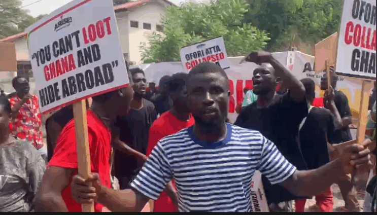 Chanting slogans and holding placards reading “Bring Ken Home,” “You Can’t Loot Ghana and Hide Abroad,” “Ken Is Needed in Ghana,” etc members of Arise Ghana are maintaining a steadfast presence outside the U.S. Embassy, vowing to continue their protest until former Finance Minister Ken Ofori-Atta returns to Ghana to face investigations into alleged financial mismanagement.