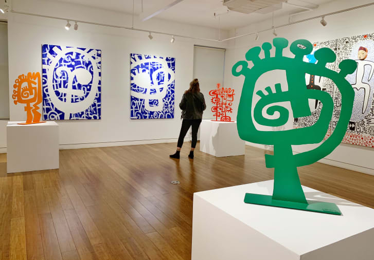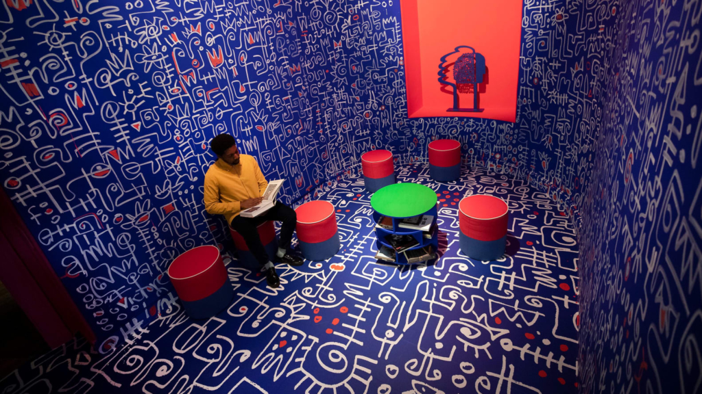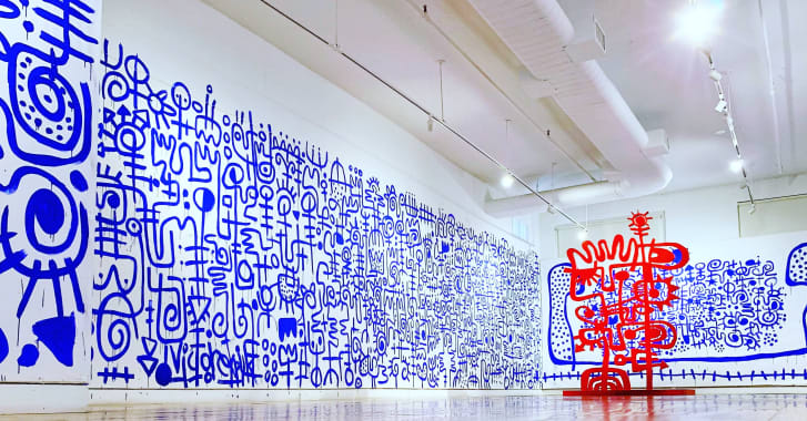 His room-sized installation, "Shrine to Wisdom," invites visitors to sit and learn, while immersed in one of his signature murals, which is based on an ancient writing system.