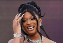 Megan Thee Stallion takes a walk on the wild side in a striped catsuit & sky-high sandals