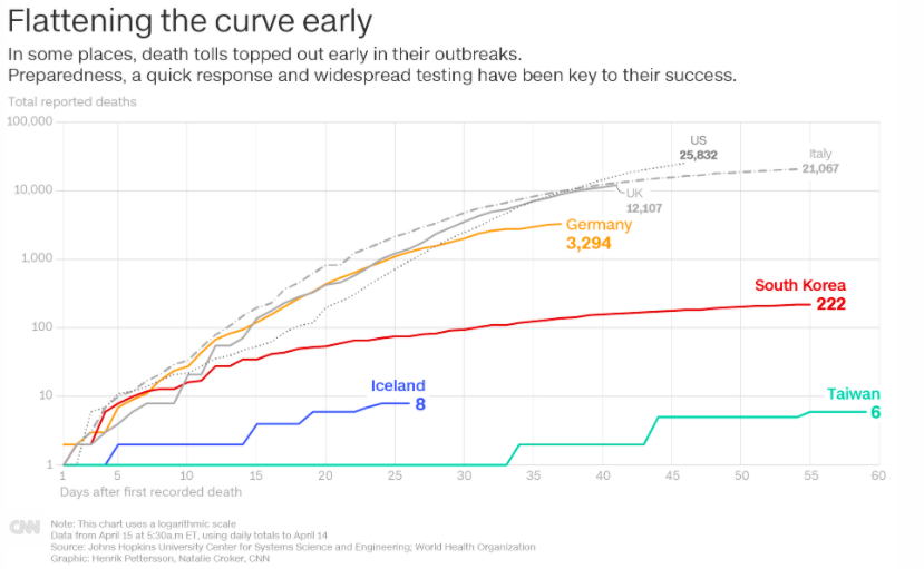 Compare that to the United States -- now the world's hardest-hit nation, at least in raw numbers -- which has reported at least 26,000 deaths. Even when you take population size into account, a level of success like Taiwan's could have meant just 83 deaths in the US.