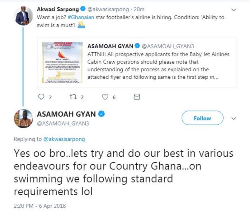 Gyan tweeted back to the BBC's Akwasi Sarpong, who had highlighted that swimming was a condition of employment, that they were "following standard requirements lol".