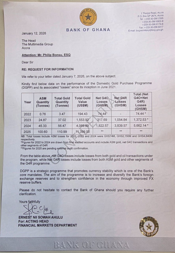 In its formal response dated January 12, 2026, the Bank of Ghana provided year-by-year data covering gold quantities purchased, total values and net losses for 2022, 2023 and 2024. However, the central bank left loss figures for 2025 blank, explaining that the year’s results are “pending external audit confirmation”.